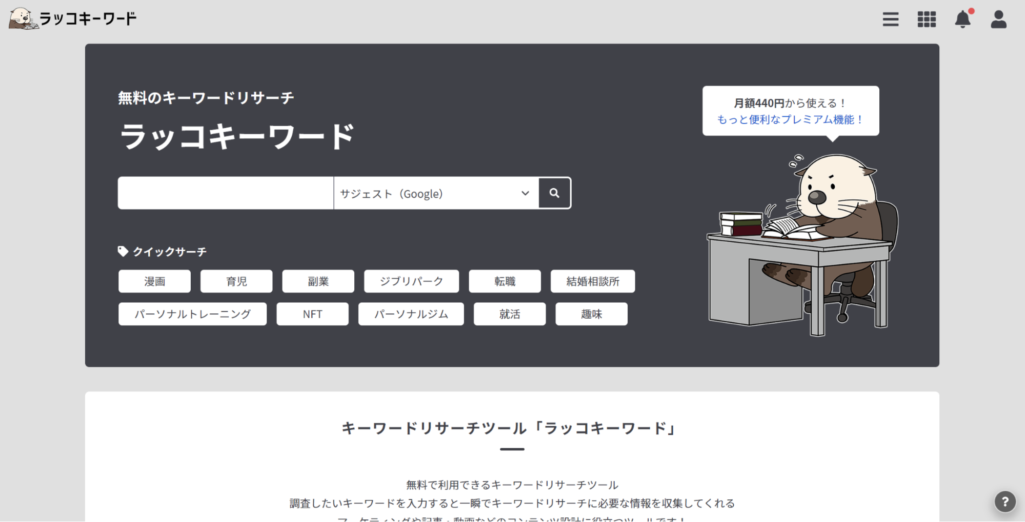 「Googleトレンド」は、検索数の推移と直近と年別の急上昇ワードが調べられる無料のツールです。無料ツール「ラッコツール」内で使用できる「ラッコキーワード」もサジェストキーワードの抽出に強いツールとなっています。