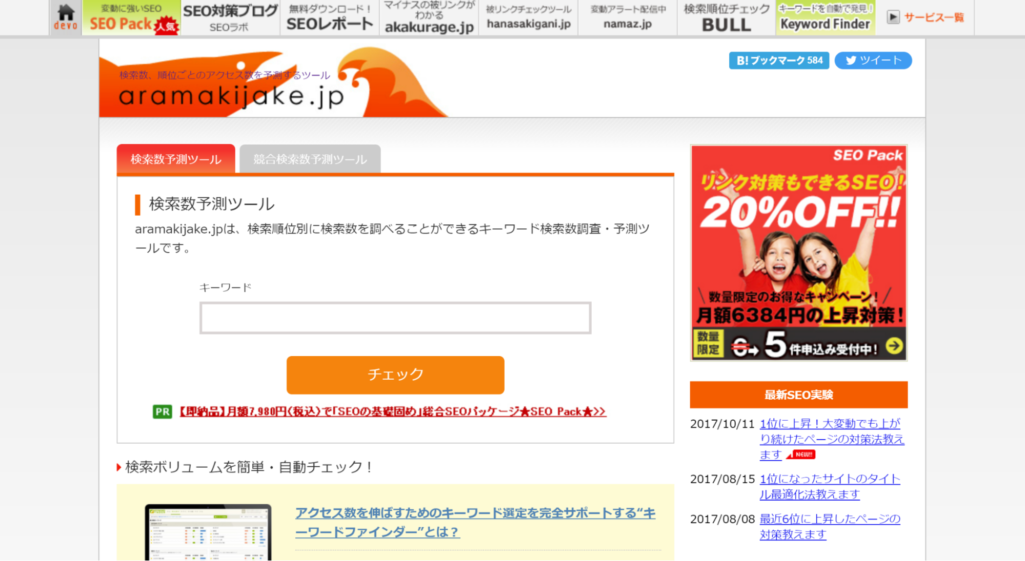 「aramakijake」は、キーワードの検索数を調査するためのツールです。搭載されている機能には、「検索数予測ツール」と「競合検索数予測ツール」の2つがあります。
