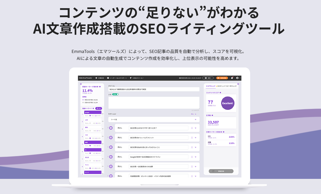 SEO対策、分析、SEOの調査、管理をクラウド上で行えます。内部対策のほか、キーワードの検索ボリュームや競合のキーワード調査もできます。