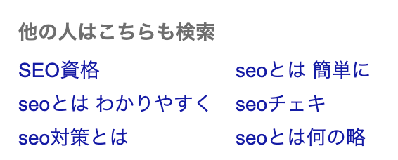 「SEO」と検索したユーザーは、他にもSEOの意味や本、SEO対策とは何かを知りたがっていることが分かります。
