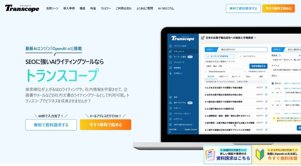 引用:OpenAI o1搭載のSEOライティングツールのトランスコープ