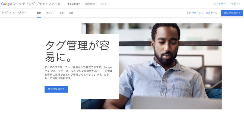 GTMの公式サイトを表示し、右上の「無料で利用する」をクリックします(クリック後にGoogleアカウントでログインする必要があります)