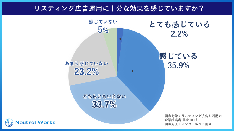 リスティング広告を運用している企業の担当者181名を対象に、リスティング広告運用に十分な効果を感じているかを質問したところ、「十分な効果を感じている」と回答した方は、全体の38.1%でした。残りの61.9%の方が「十分な効果を感じていない」もしくは「どちらともいえない」と回答しており、うまく運用できていないと感じている企業が6割以上に及ぶことが分かりました。