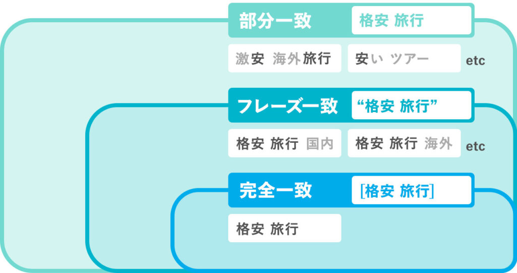 また、登録キーワードと完全に一致するマッチタイプで設定すると「旅行 格安ツアー」「安い 国内旅行」などの類似キーワードで検索したユーザーを逃してしまうことにもなります。