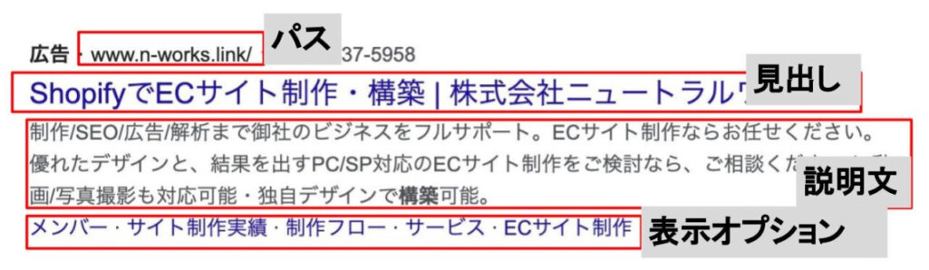 リスティング広告は、大きく分けて4つのセクションで構成されています。