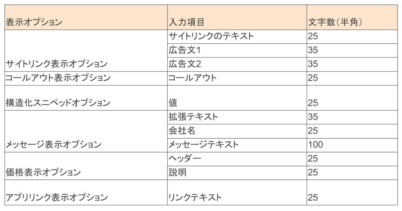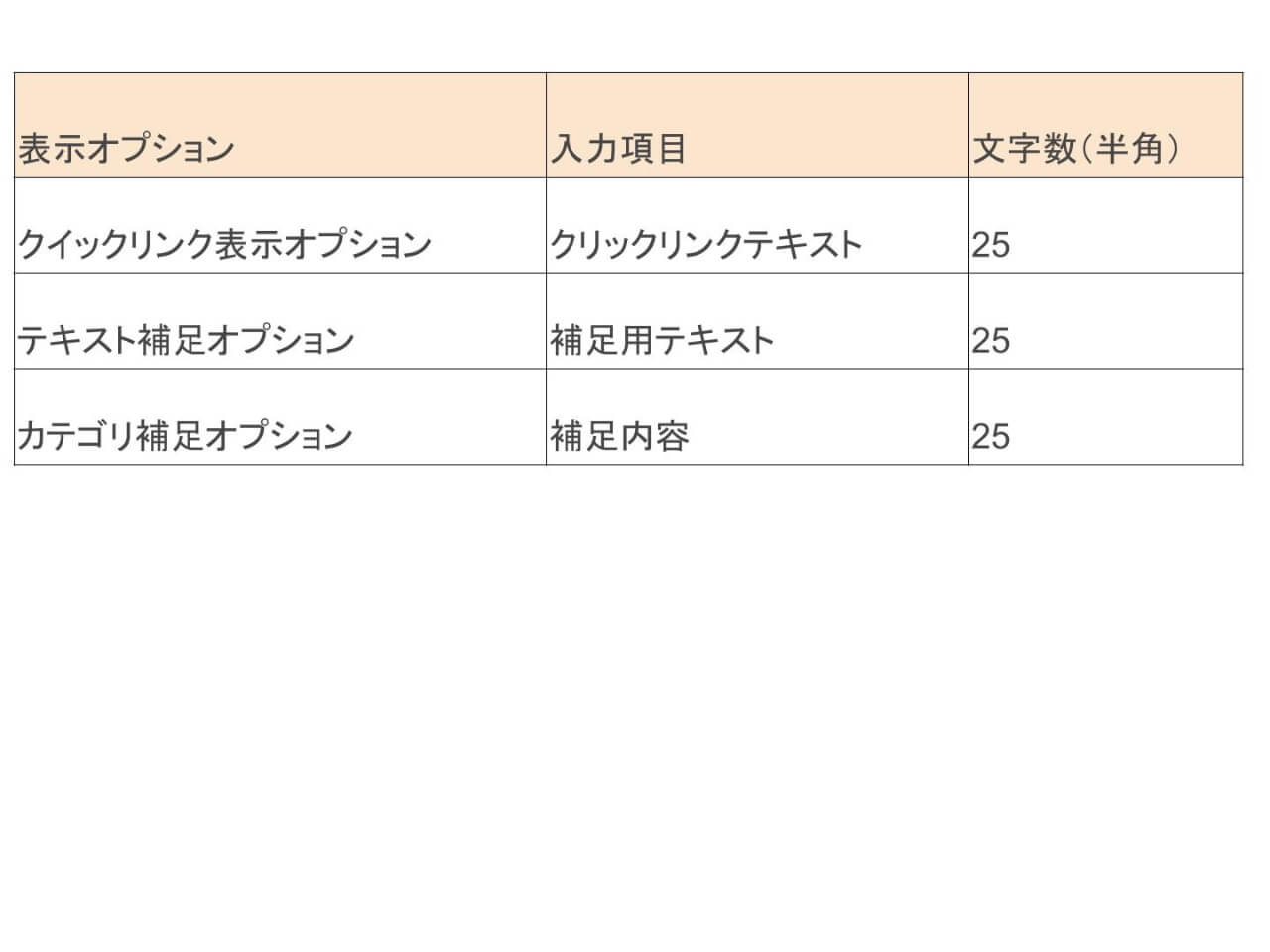 Yahoo!のリスティング広告では、Googleよりも表示オプションが少なく、すべて文字数が同じ(半角25文字/全角12文字)点が特徴です。