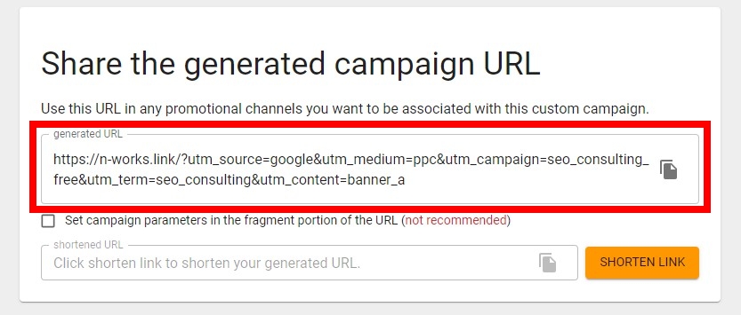 各パラメータの入力が完了したら、生成されたURLをコピーして広告のリンク先などに設定しましょう。
