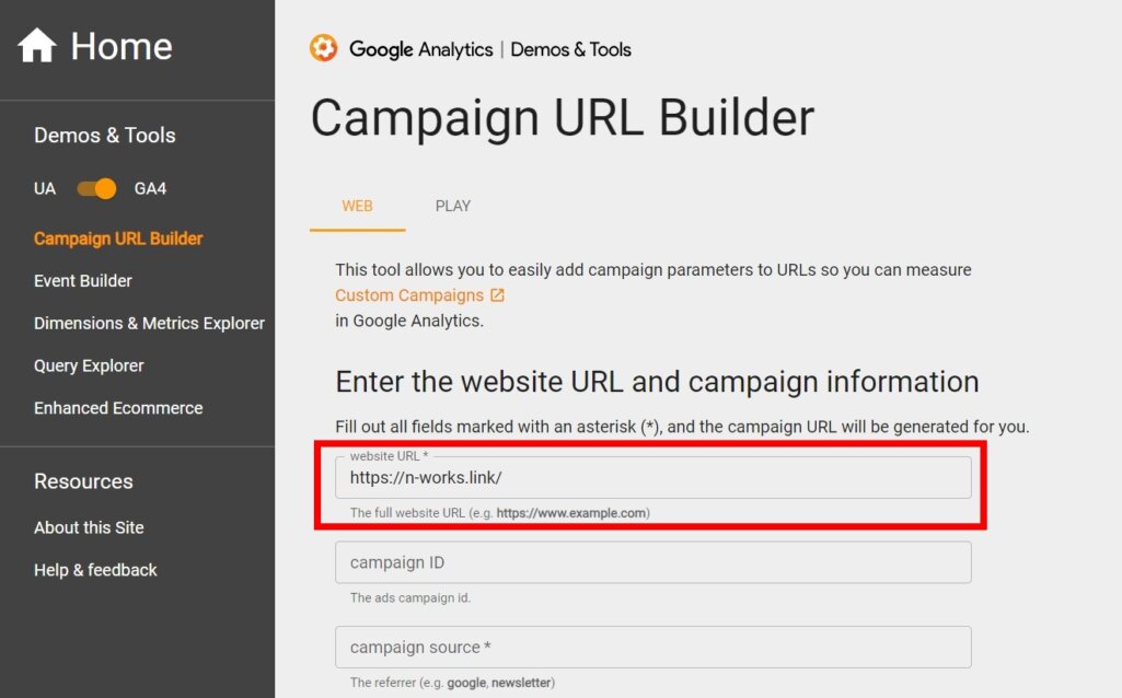まずは「Google Campaign URL Builder」を開きます。Google Campaign URL Builderは、Googleアナリティクスで使用するURLパラメータを自動で生成できる無料ツールです。