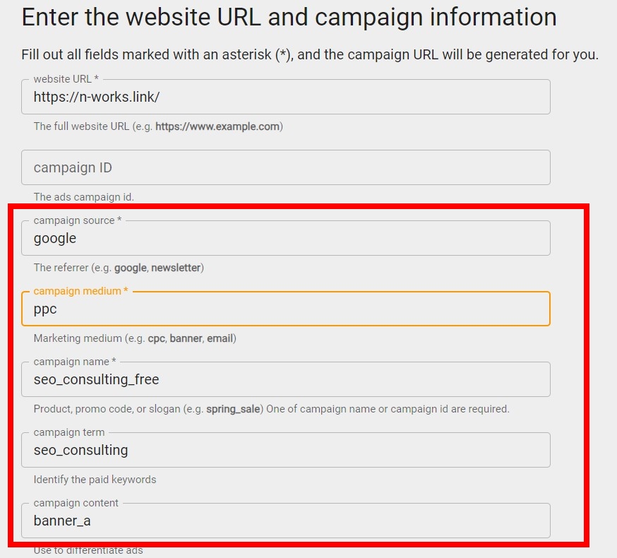 | campagin name | キャンペーンの名称 | seo_consulting_free |