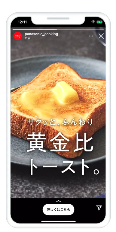 パナソニックは、Instagram広告を利用して、「オーブントースター ビストロ」の新モデルを発売する際に、動画広告を活用しています。