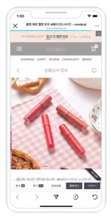 rom&nd(ロムアンド)は、韓国の美容インフルエンサーが手がける大人気の化粧品ブランドで、オンラインの売上を伸ばすため、広告予算を増やすことなく、商品タグ付きダイナミック広告を配信しました。
