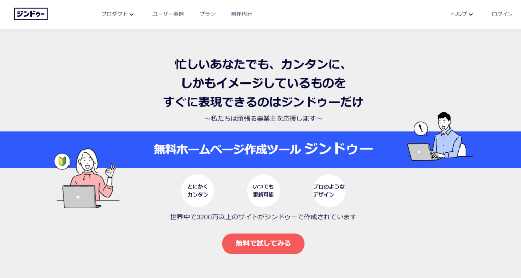 ジンドゥー(Jimdo)は、ジンドゥー(Jimdo)は、コーディング一切不要でホームページ制作が可能なサービスです。ジンドゥー(Jimdo)は2つのサービスから選択可能で、AIの質問に回答するだけでホームページの土台を作成できる 「AI ビルダー」と、コーディングできる方ならプチ・フルカスタマイズも可能な「クリエイター」があります。またSNS連携やレスポンシブレイアウト、GoogleマップやYouTube動画などが設置できるコンテンツの豊富さが特徴です。