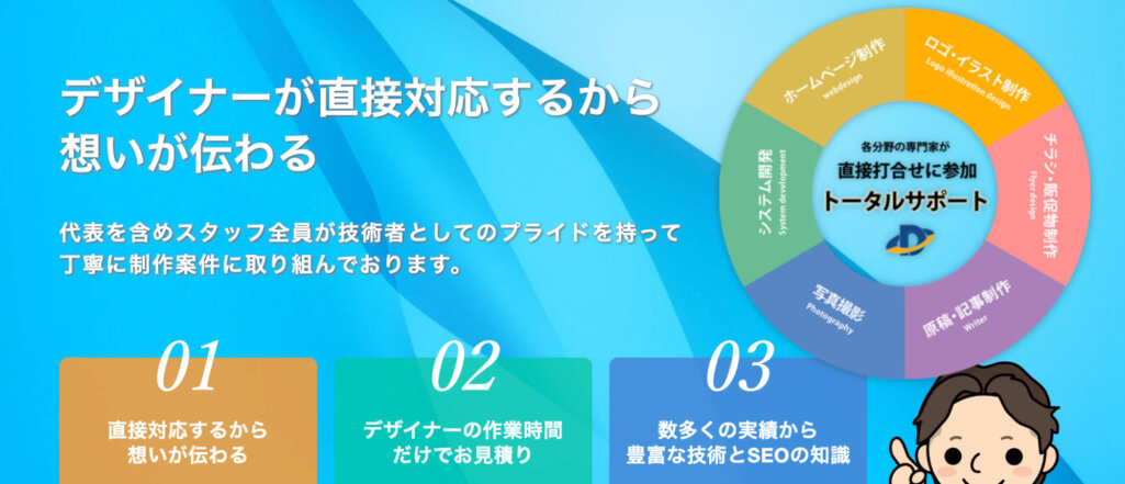 同社は、全国のweb制作案件に対応しており、コンテンツのご提案・デザイン・SEO対策・ログ解析、公開後の集客サポートや広告運用まで一貫して承っております。