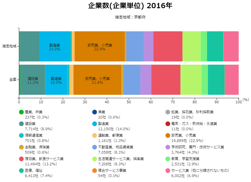 以下の画像は、経済産業省・内閣府が提供しているRESAS – 地域経済分析システムの2016年時点・京都都の企業数データです。