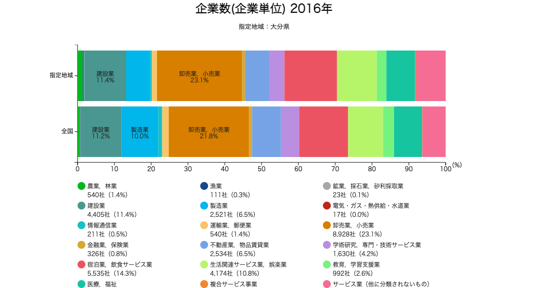 大分の企業は、どんな業界が多いのでしょうか?大分に集中している業界のweb制作が多いことが推測されます。地方になりますので、色んな企業が参入していますがデータを元に見ていきましょう。以下の画像は、経済産業省・内閣府が提供しているRESAS – 地域経済分析システムの2016年時点・大分都の企業数データです