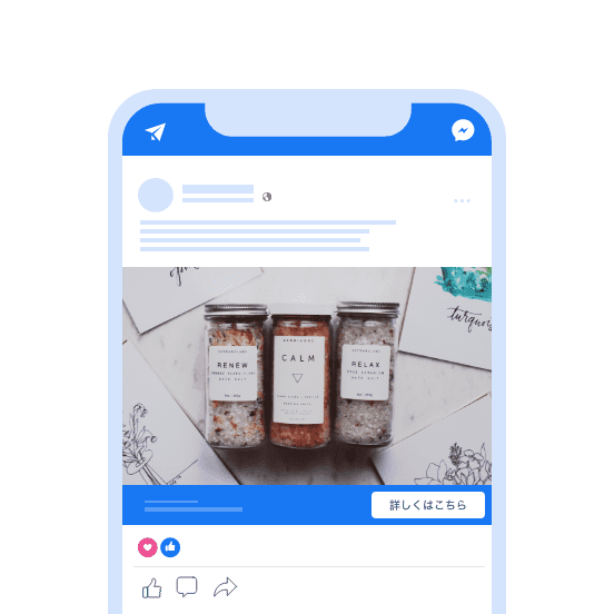 目的別に配信が可能Facebook広告は、認知・検討・購買から配信の目的を選択ができ、それぞれの目的別に的確に広告配信ができます。ユーザーの購買ステップごとに配信ができるので、認知から購買まで、潜在層から顕在層まで幅広くアプローチしていきたい方にはとてもおすすめです。
