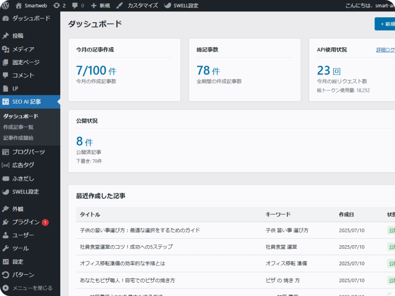 WordPress管理画面内でキーワード候補の調査から、構成・原稿作成、下書き保存、ページ編集、記事公開まですべて完結。外部ツールを行き来する必要がないので、効率的な運用が可能です。