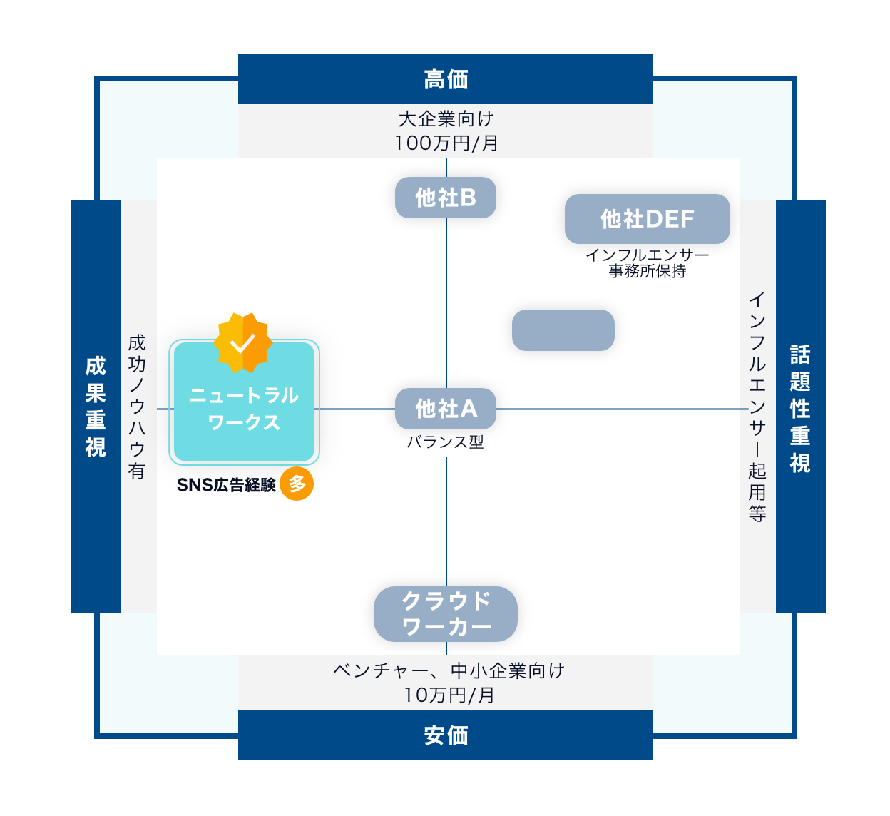 ニュートラルワークスは高コストになりがちなインフルエンサー起用ではなく広告運用の成功ノウハウを踏まえた企画・分析・改善力が強みです。